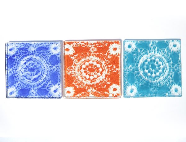 These coasters are backed by 4 rubber feet, so they can be used safely under hot drinks. They are decorated by applying enamel through vintage lace or by firing decals onto them.